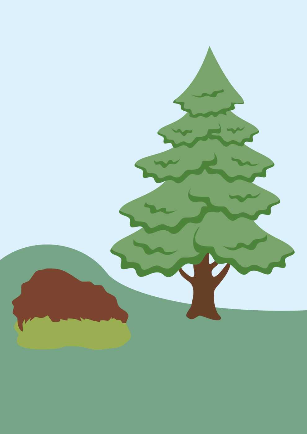 Картинка-фон с изображением ёлки и берлоги. Силуэтные цветные картинки: солнышко, тучка, грибы, медведь.
