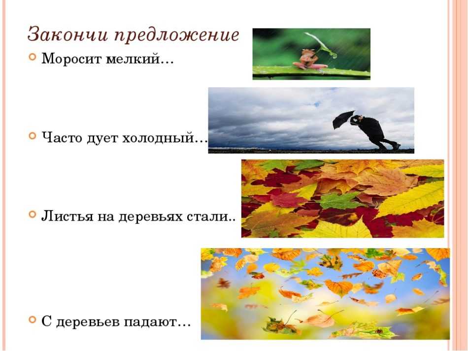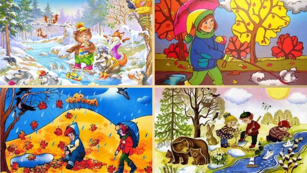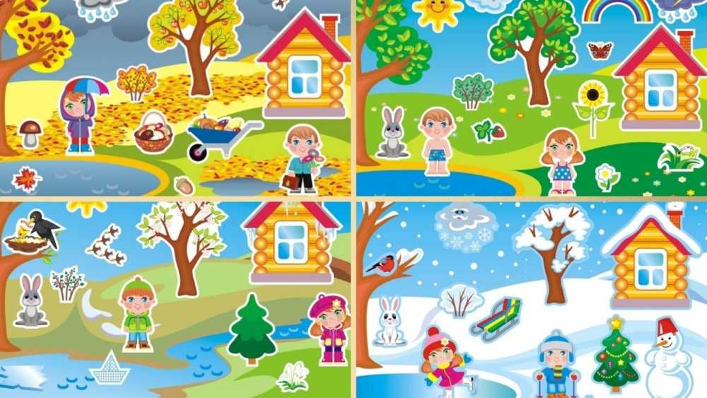 Для игры подготовьте картинки, которые изображают сюжеты, происходящие в разные сезоны года: идущий снег, дождь и лужи, желтые деревья, яркое солнце, снеговики, распускающиеся цветы, дети на лыжах, скворцы в скворечниках и прочее. Разложите изображения перед воспитанником, попросите выбрать картинки, действия в которых могут происходить только осенью.