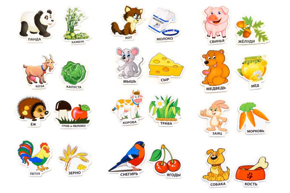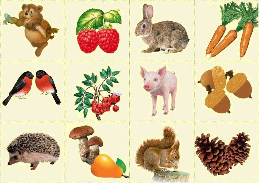 Игра ознакомляет с окружающим миром, у дошкольников формируется представление о том, чем питаются животные в дикой природе. Для игры подготовьте изображения лесных зверей, а также их кормов: растений, орехов, грибов.