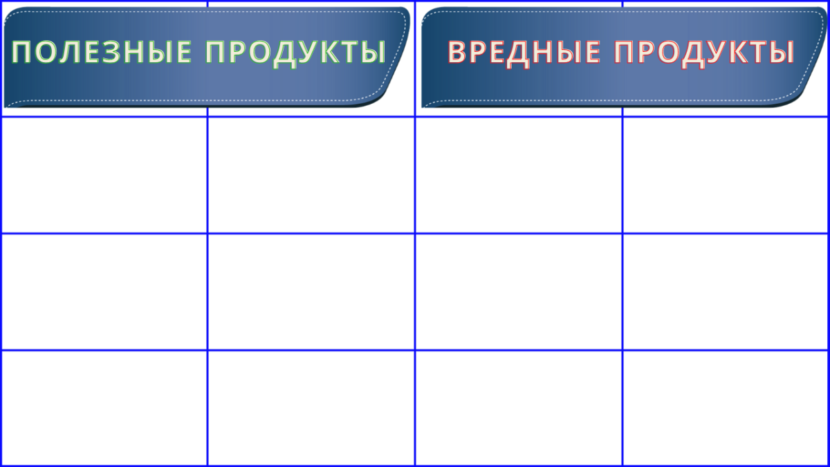 Для игры сделайте две таблицы с равными ячейками: одна – «Полезные продукты», вторая – «Вредные продукты». Также вырежьте карточки, изображающие всевозможную пищу. По величине карточки должны соответствовать табличным ячейкам.