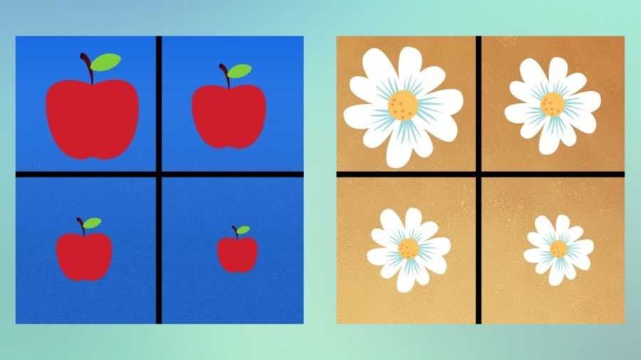 Для игры подготовьте комплекты двух изображений: яблок и цветочков. В каждый комплект должны входить несколько картинок разной величины: крупные, средние, мелкие. Разделите игроков на две команды: первую назовите «Пчела», ее участники будут собирать цветочки, вторую – «Гусеница», ее игроки будут добывать яблочки. На стол кучей выложите картинки. На другом конце помещения разместите два столика, на них участники будут класть картинки в ряд по возрастанию величины.