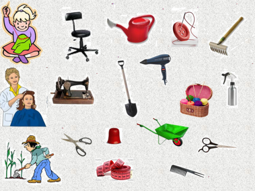 Игра соревновательная. Для нее подготовьте карточки, изображающие предметы, которые относятся к разным профессиям. Для каждого игрока, или для группы игроков, если детей много, определите профессию. Игровая задача – быстрее остальных отыскать в ворохе три картинки, относящиеся к заданной профессии. Например: повар – колпак, кастрюля, черпак. Или: врач – белый халат, градусник, шприц. Или: швея – нитки, ножницы, швейная машинка. Или: строитель – каска, дрель, мастерок.