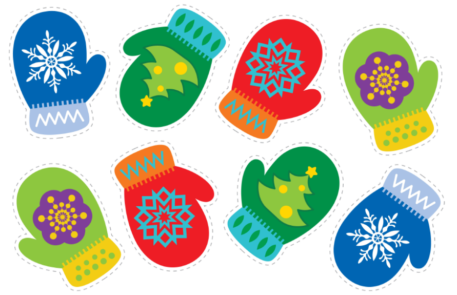 Для игры подготовьте картинки варежек и шапочек 4-х цветов: зеленого, красного, желтого, голубого.