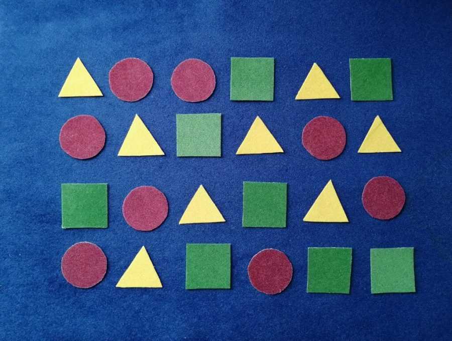 Для игры сделайте картонные геометрические формы разных цветов. Фигуры распределите попарно по числу игроков.