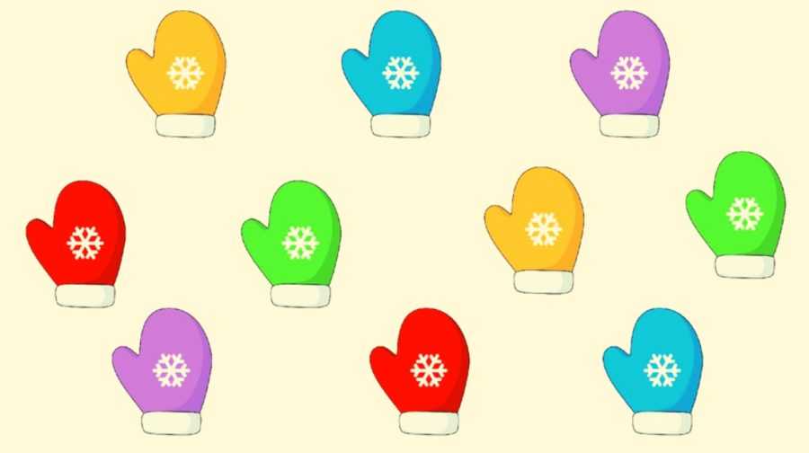 Расскажите детям, что куклы собираются на прогулку. Шапочки они уже надели, а варежки такого же цвета подобрать не могут, нужно им помочь. Хаотично разложите картинки на столе. Задача играющих – найти для каждой шапочки подходящие по цвету варежки.