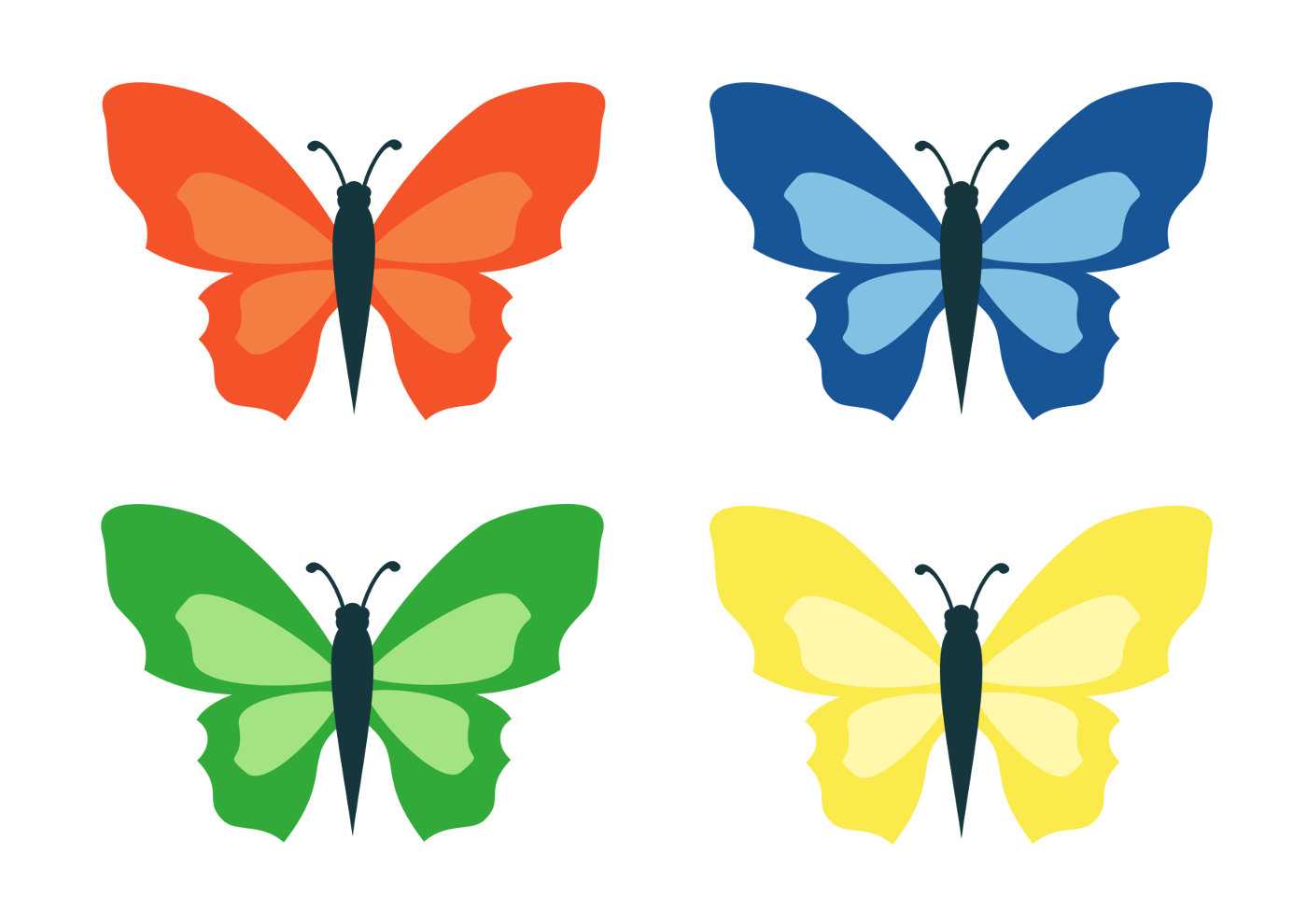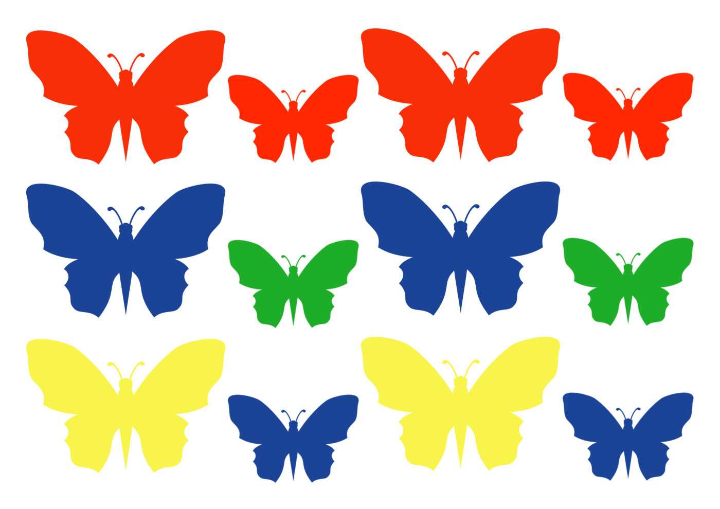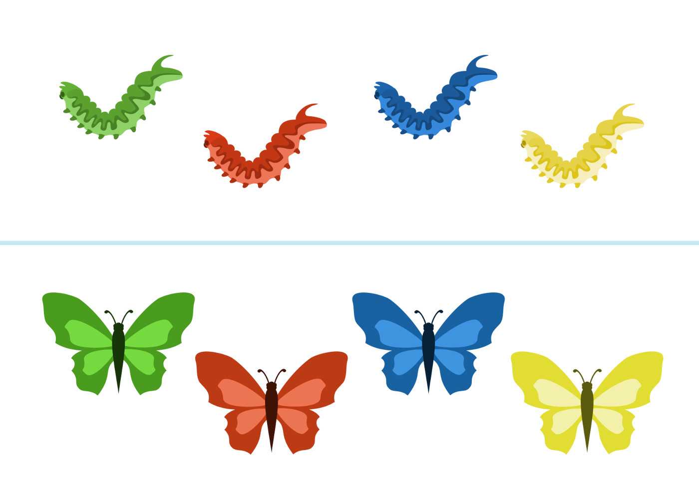 — Каждая бабочка когда-то была гусеницей. Разложите перед собой гусениц. Назовите, какого цвета каждая гусеница. А теперь давайте превращать гусениц в бабочек. Желтая гусеница станет желтой бабочкой. А какими бабочками станут другие гусеницы? (Дети накладывают по цвету силуэтные картинки бабочек на силуэтные картинки гусениц).
