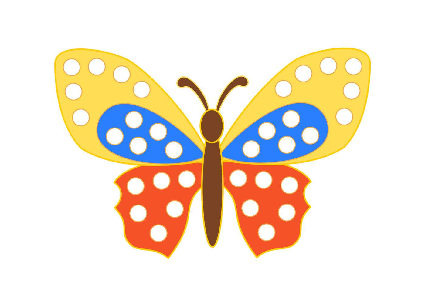 — Сделайте бабочке крылья из прищепок разных цветов. только крылья у бабочки должны быть одинаковые: прикрепили слева красную прищепку, значит и справа прикрепите красную прищепку.