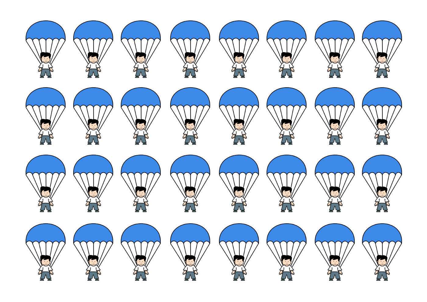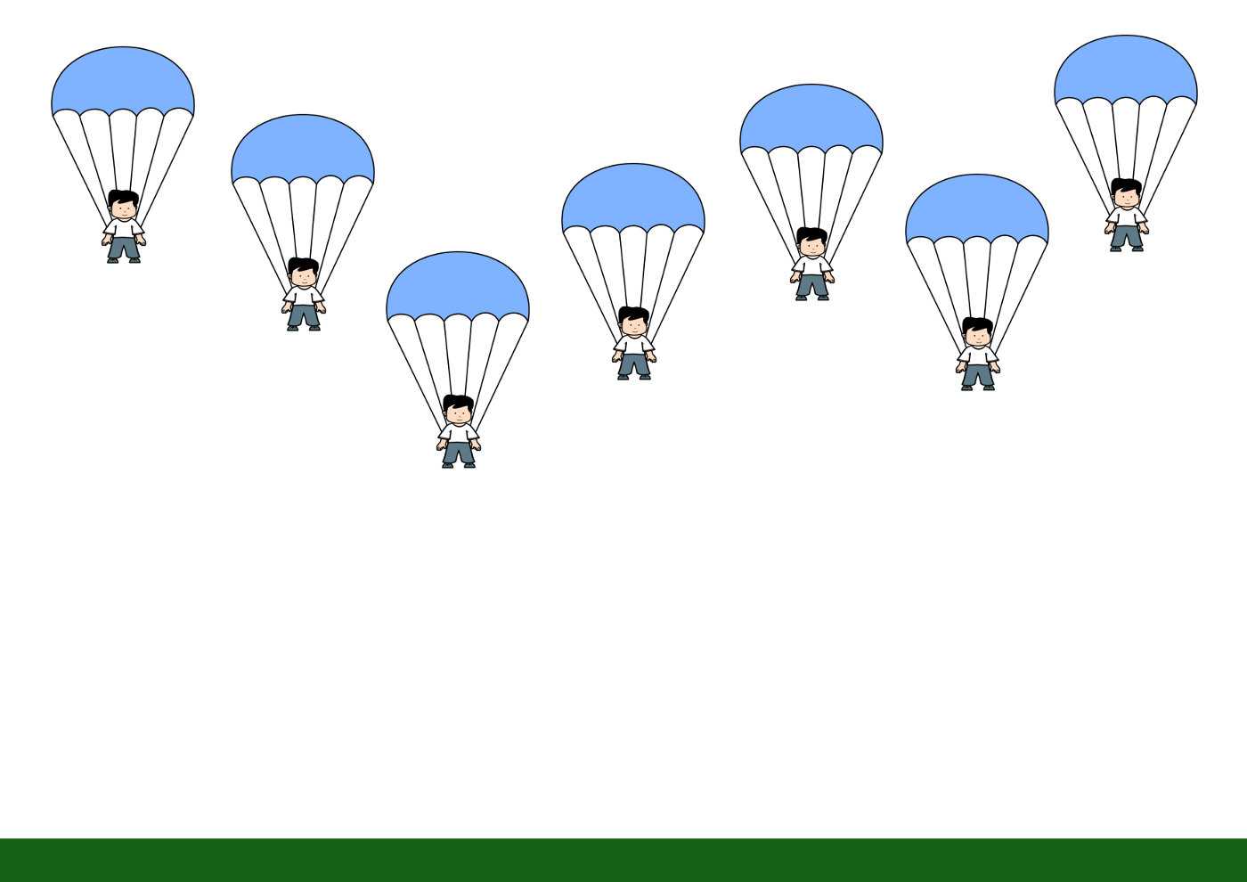 Лист бумаги с нарисованными вверху парашютистами и землей внизу.