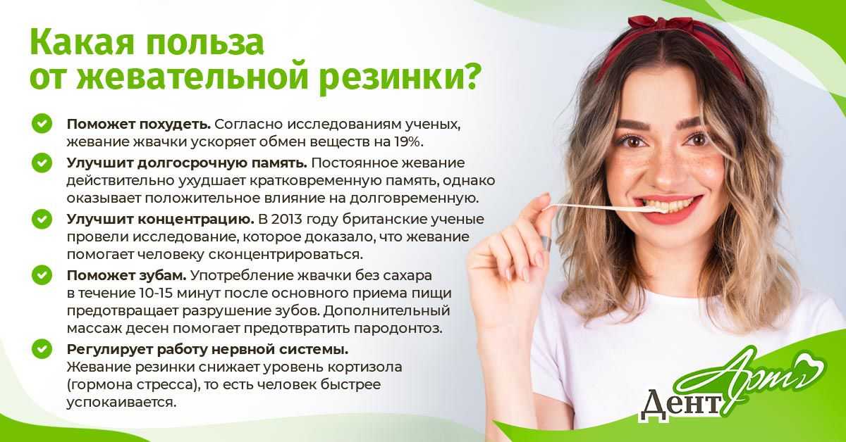 - Поможет зубам. Употребление жвачки без сахара в течение 10-15 минут после основного приема пищи предотвращает разрушение зубов. Дополнительный массаж десен помогает предотвратить пародонтоз.