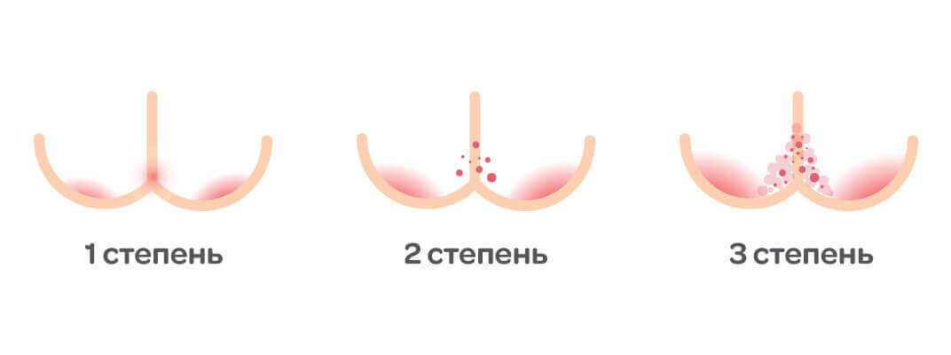 Интертриго локализируются в паху и ягодицах. Причиной появления интертриго является высокая влажность, появляются потертости, трещины, пролежни.