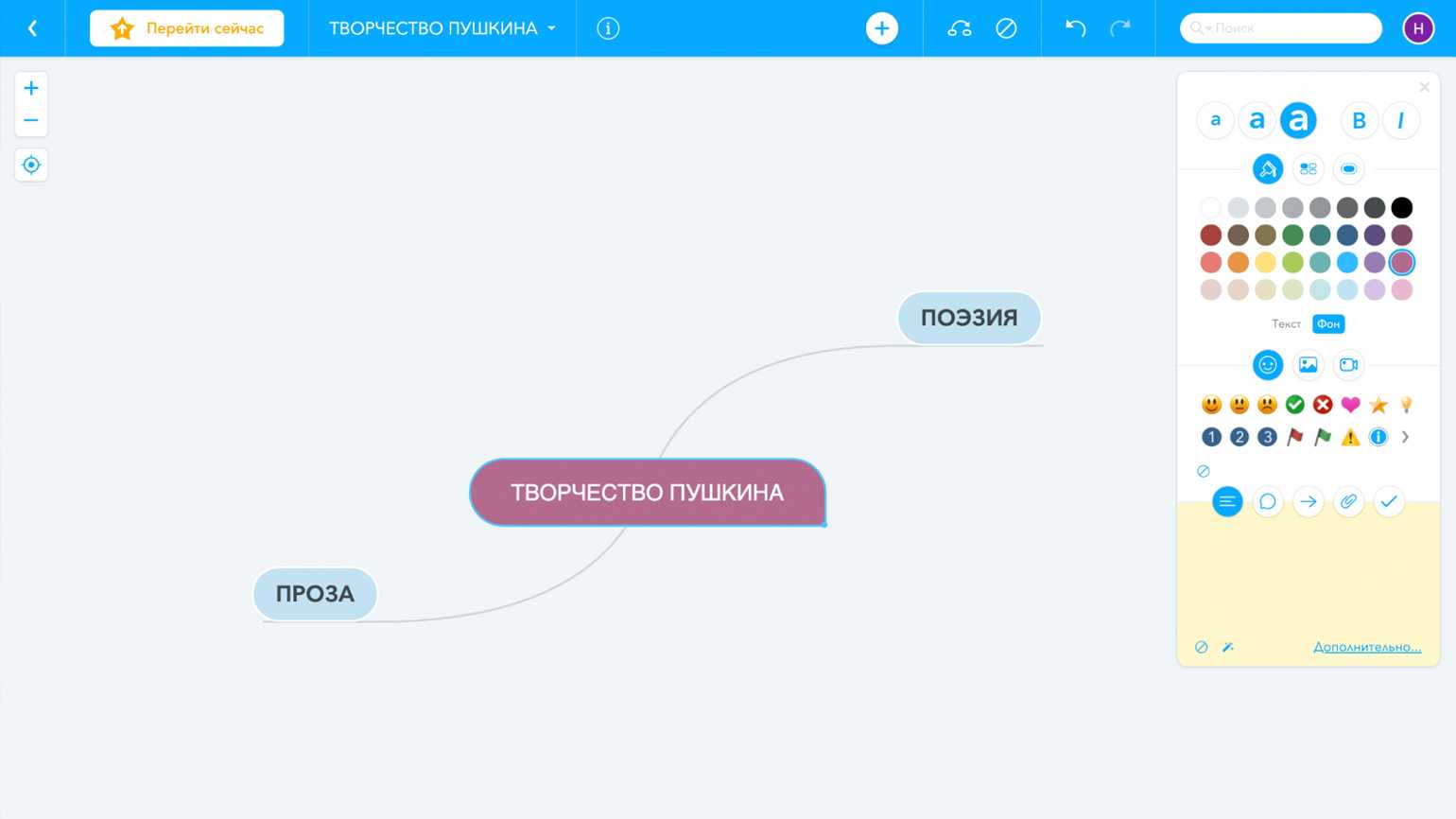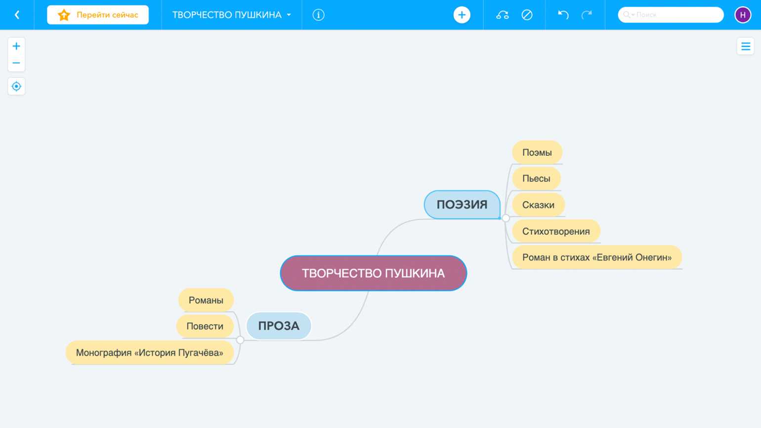 Независимо от способа создания, интеллект-карта всегда будет обладать древовидной структурой, обозначающей иерархию между элементами. На примере простой карты с классификацией произведений Пушкина и с помощью сервиса MindMeister покажем, как выстраивается такая структура.