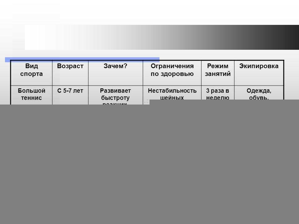 Вид спорта Возраст Зачем?Ограничения по здоровью Режим занятий Экипировка Большой теннис С 5-7 лет Развивает быстроту реакции, ловкость, координацию движений, прыгучесть. Совершенствует самообладание, интуицию. Учит тактике и стратегии. Нестабильность шейных позвонков, плоскостопие, миопия, язвенная болезнь желудка или 12-перстной кишки. 3 раза в неделю по 2 часа. Одежда, обувь, ракетка, мячи.