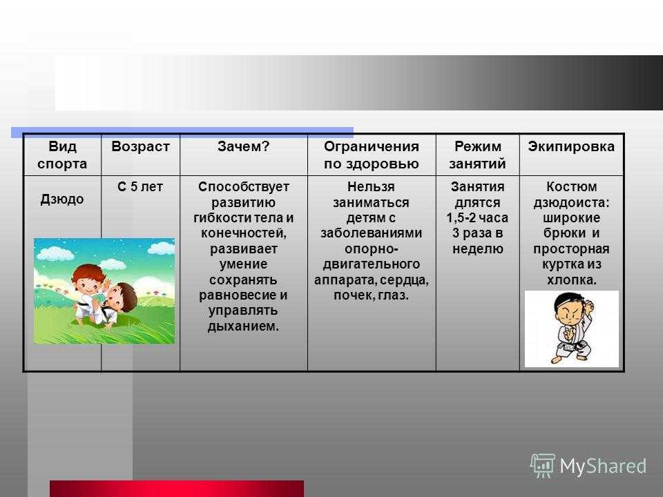 Вид спорта Возраст Зачем?Ограничения по здоровью Режим занятий Экипировка Дзюдо С 5 лет Способствует развитию гибкости тела и конечностей, развивает умение сохранять равновесие и управлять дыханием. Нельзя заниматься детям с заболеваниями опорно- двигательного аппарата, сердца, почек, глаз. Занятия длятся 1,5-2 часа 3 раза в неделю Костюм дзюдоиста: широкие брюки и просторная куртка из хлопка.