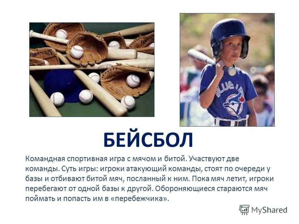 БЕЙСБОЛ Командная спортивная игра с мячом и битой. Участвуют две команды. Суть игры: игроки атакующий команды, стоят по очереди у базы и отбивают битой мяч, посланный к ним. Пока мяч летит, игроки перебегают от одной базы к другой. Обороняющиеся стараются мяч поймать и попасть им в «перебежчика».