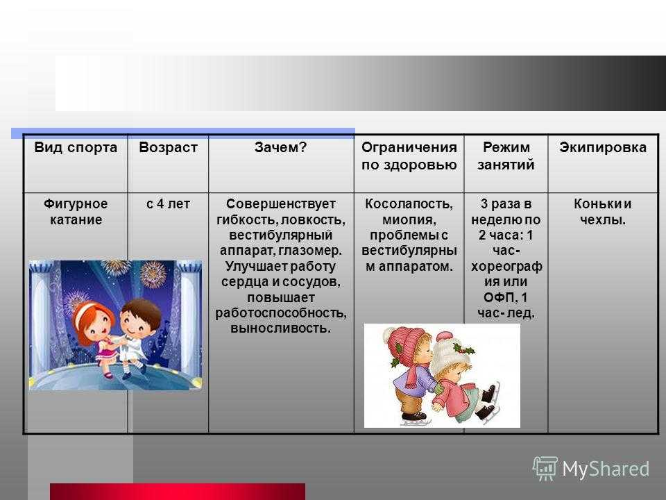 Вид спорта Возраст Зачем?Ограничения по здоровью Режим занятий Экипировка Фигурное катание с 4 лет Совершенствует гибкость, ловкость, вестибулярный аппарат, глазомер. Улучшает работу сердца и сосудов, повышает работоспособность, выносливость. Косолапость, миопия, проблемы с вестибулярны м аппаратом. 3 раза в неделю по 2 часа: 1 час- хореограф ия или ОФП, 1 час- лед. Коньки и чехлы.