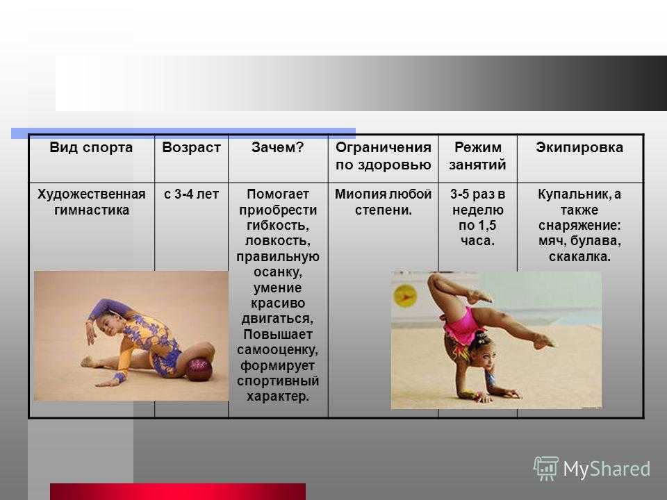 Вид спорта Возраст Зачем?Ограничения по здоровью Режим занятий Экипировка Художественная гимнастика с 3-4 лет Помогает приобрести гибкость, ловкость, правильную осанку, умение красиво двигаться, Повышает самооценку, формирует спортивный характер. Миопия любой степени. 3-5 раз в неделю по 1,5 часа. Купальник, а также снаряжение: мяч, булава, скакалка.