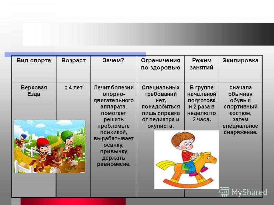 Вид спорта Возраст Зачем?Ограничения по здоровью Режим занятий Экипировка Верховая Езда с 4 лет Лечит болезни опорно- двигательного аппарата, помогает решить проблемы с психикой, вырабатывает осанку, привычку держать равновесие. Специальных требований нет, понадобиться лишь справка от педиатра и окулиста. В группе начальной подготовк и 2 раза в неделю по 2 часа. сначала обычная обувь и спортивный костюм, затем специальное снаряжение.