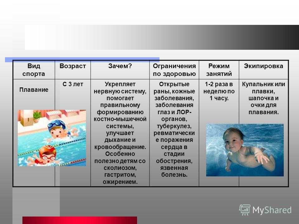 Вид спорта Возраст Зачем?Ограничения по здоровью Режим занятий Экипировка Плавание С 3 лет Укрепляет нервную систему, помогает правильному формированию костно-мышечной системы, улучшает дыхание и кровообращение. Особенно полезно детям со сколиозом, гастритом, ожирением. Открытые раны, кожные заболевания, заболевания глаз и ЛОР- органов, туберкулез, ревматически е поражения сердца в стадии обострения, язвенная болезнь. 1-2 раза в неделю по 1 часу. Купальник или плавки, шапочка и очки для плавания.