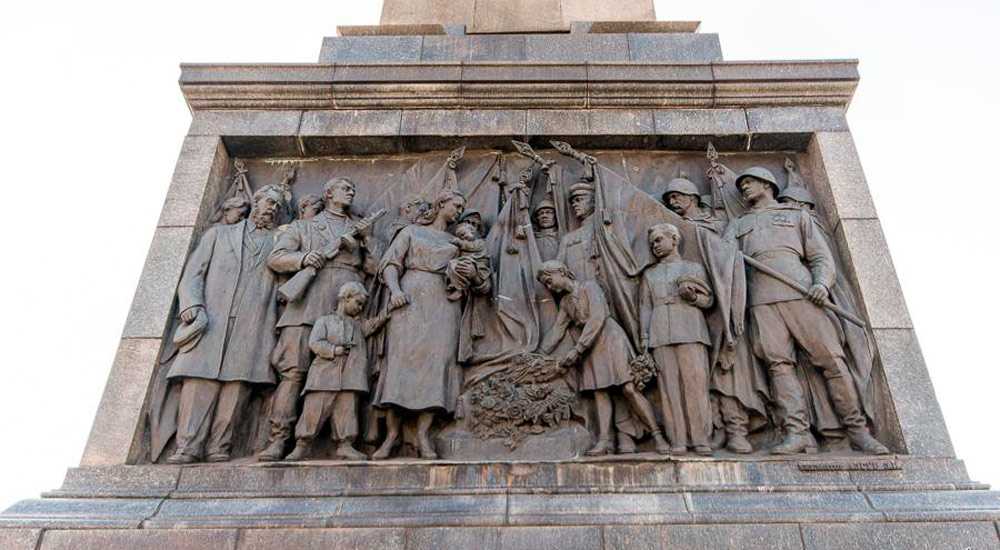 Фасад памятника украшен орденами и барельефами, которые изображают основные события, связанные с победой в Великой отечественной войне